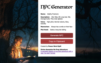 NPC Generator to rozszerzenie przeglądarki Firefox, które ułatwia tworzenie postaci niezależnych (NPC) do gier fabularnych. Dzięki różnorodnym opcjom dostosowywania, użytkownicy mogą generować pełne postacie lub regenerować poszczególne elementy, takie jak imię czy cechy charakteru, aby idealnie dopasować je do swoich potrzeb. To narzędzie jest szczególnie przydatne dla mistrzów gry, którzy szukają inspiracji podczas sesji RPG.